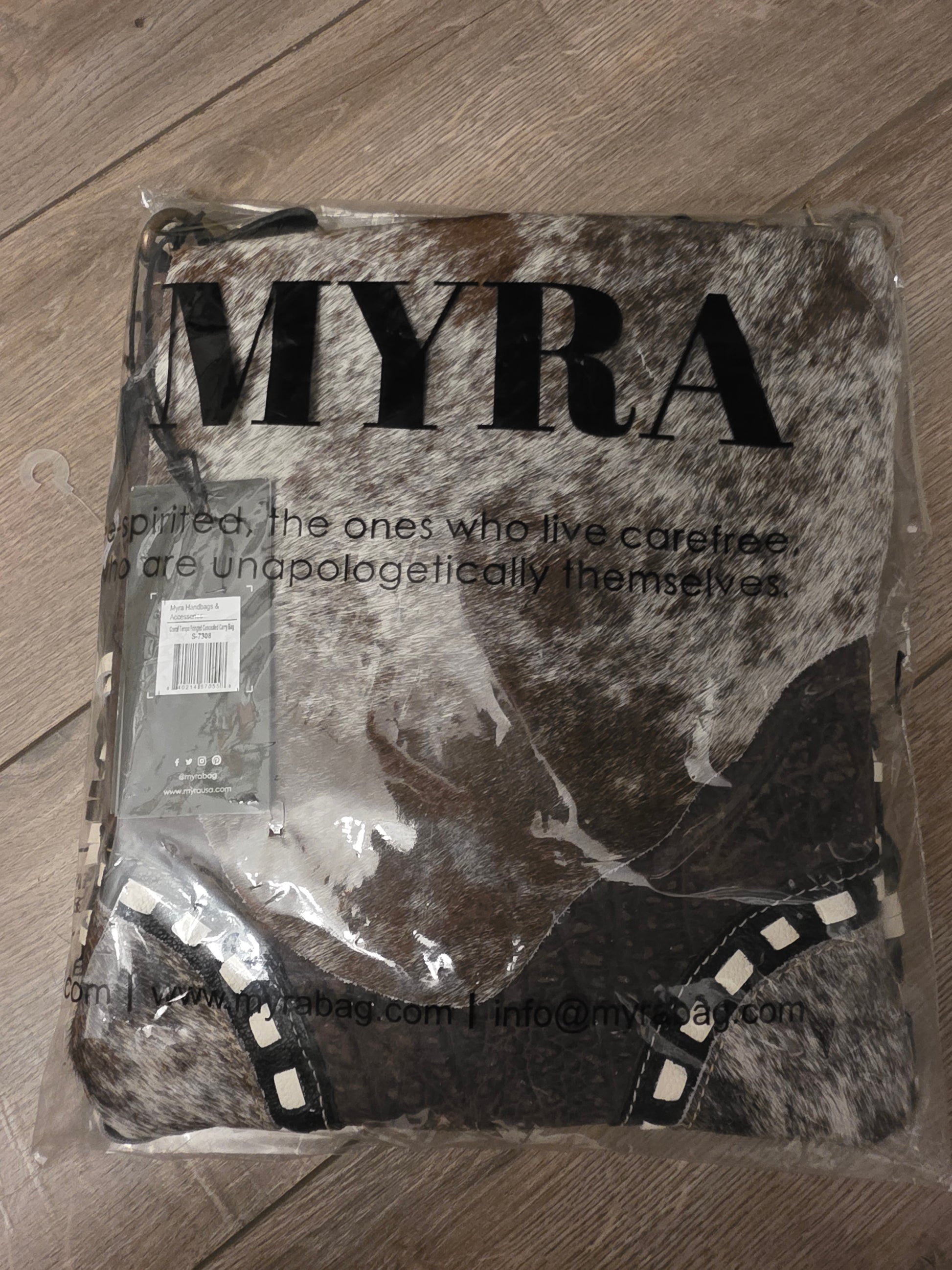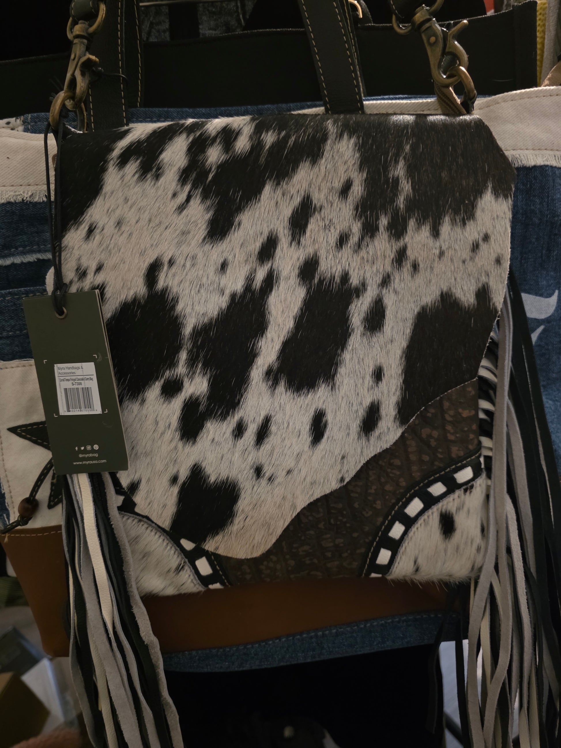 This amazing bag is sure to be eye-catching with its irregular trim front flap of hair-on hide and special leather fringe treatment. A front embossed leather panel in deep rich bourbon brown completes the front while ebony leather completes the back, including two zippered pockets for the ultimate in convenience. Matching leather adjustable shoulder strap is fully detachable.