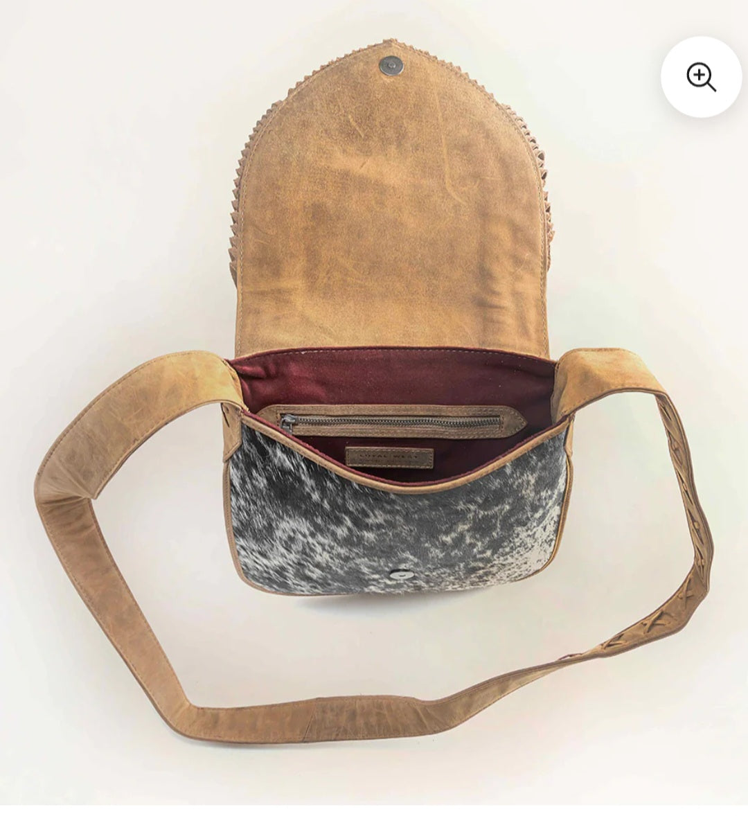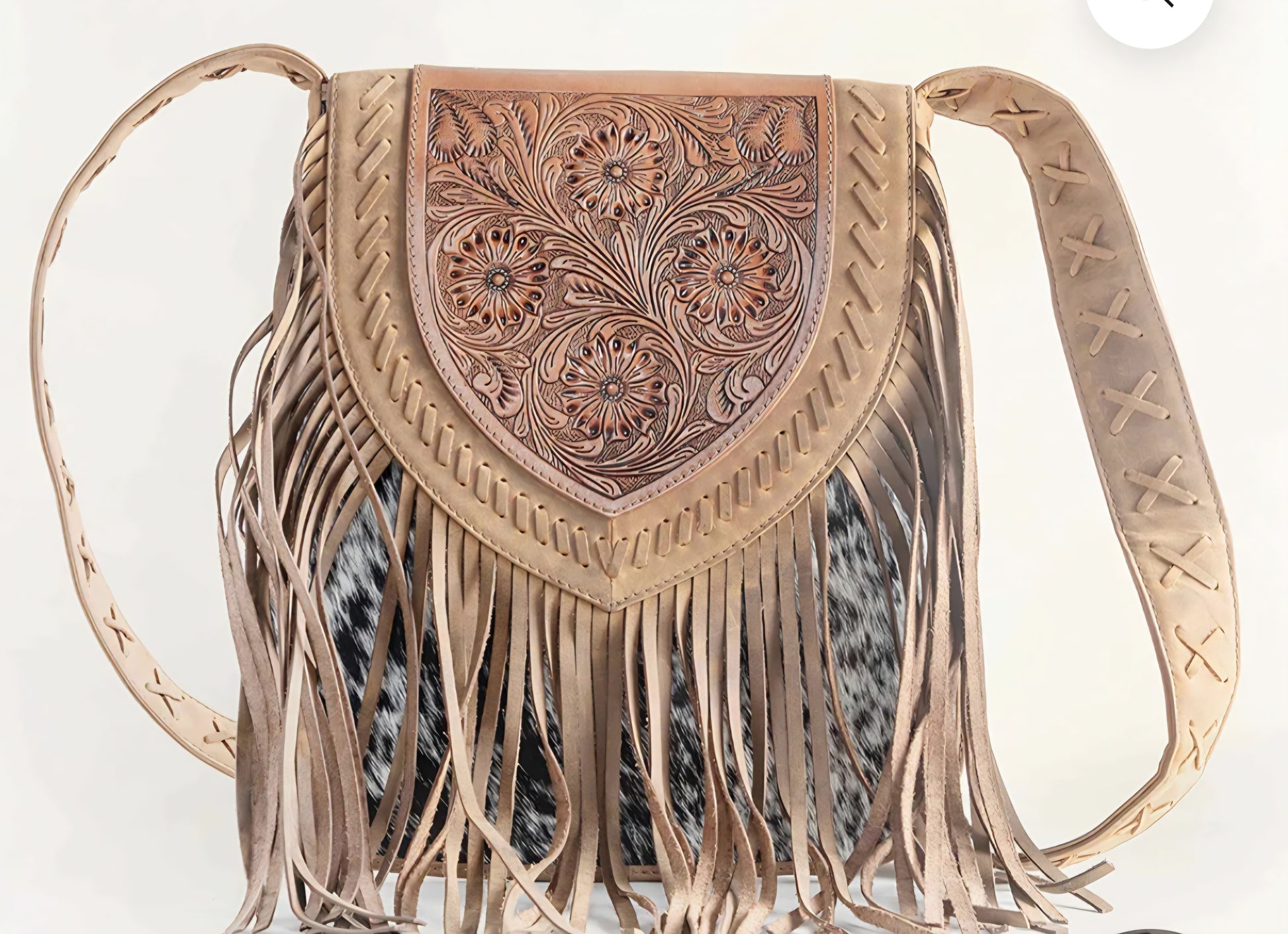 The Desert Desire Large Flap is a stunning crossbody bag crafted from a combination of hair-on cowhide and smooth calfskin. The intricate handtooled leather on the flap adds a unique, artisanal touch, while the fringes give it a free-spirited, boho-inspired feel.